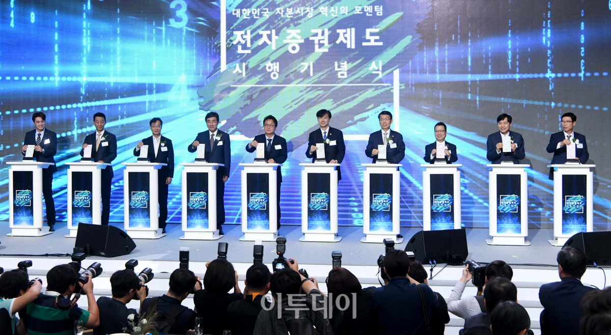 [포토] 전자증권제도 시행기념식 '종이증권은 세절기로'