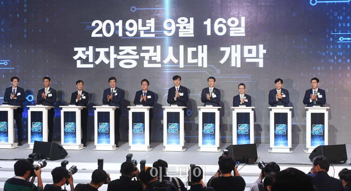 조국 법무부 장관과 은성수 금융위원장, 민병두 국회 정무위원장 등이 16일 서울 여의도 콘래드 호텔에서 열린 전자증권제도 시행 기념식에서 종이증권을 세절기에 넣는 퍼포먼스를 마친 뒤 박수를 치고 있다.