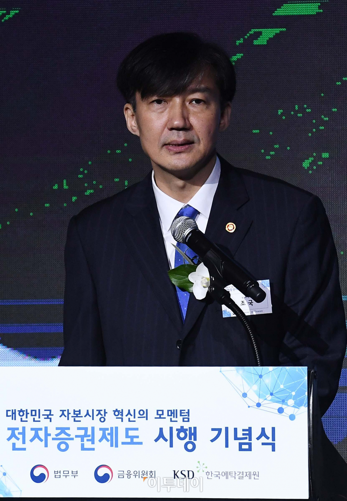 조국 법무부 장관이 16일 서울 여의도 콘래드 호텔에서 열린 전자증권제도 시행 기념식에서 축사를 하고 있다.