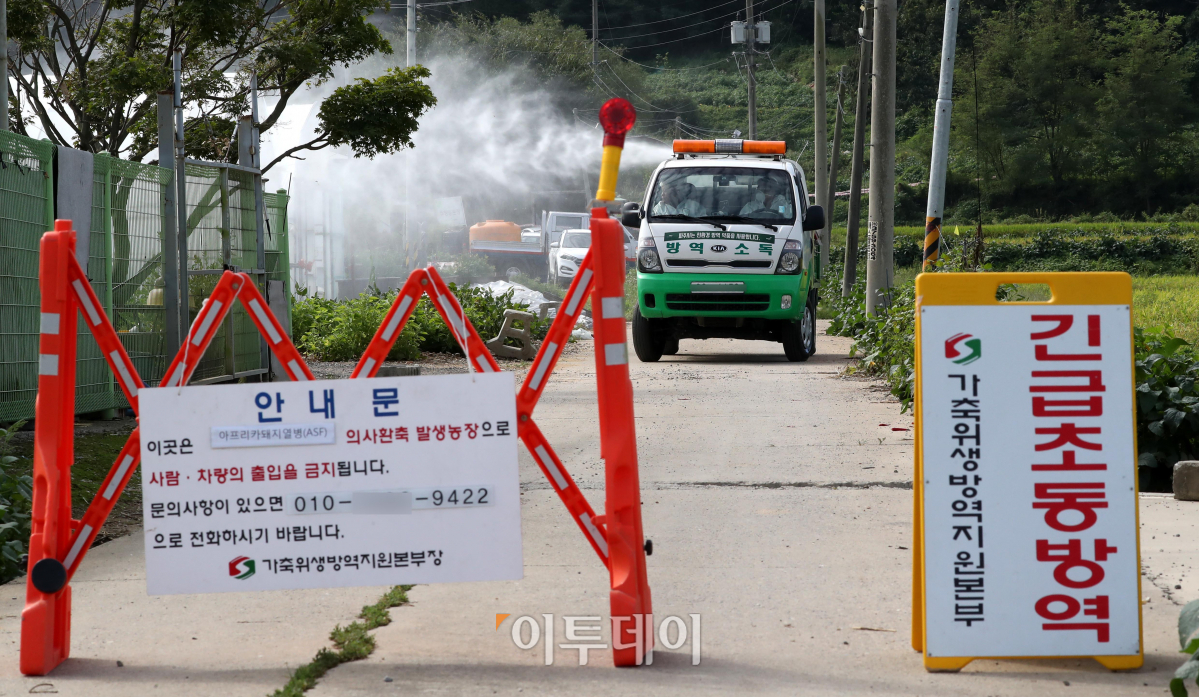 17일 돼지 전염병인 아프리카돼지열병(ASF)이 발생한 경기도 파주시의 한 양돈농장 입구에서 출입이 통제된 채 소독 작업 및 역학조사 등이 이뤄지고 있다. ‘돼지 흑사병’으로 불리기도 하는 ASF는 바이러스성 제1종 가축전염병으로 치사율이 100%에 달하는 등 치명적이나 아직 예방백신이 개발되지 않았다. 사람에게는 전염되지는 않는다.