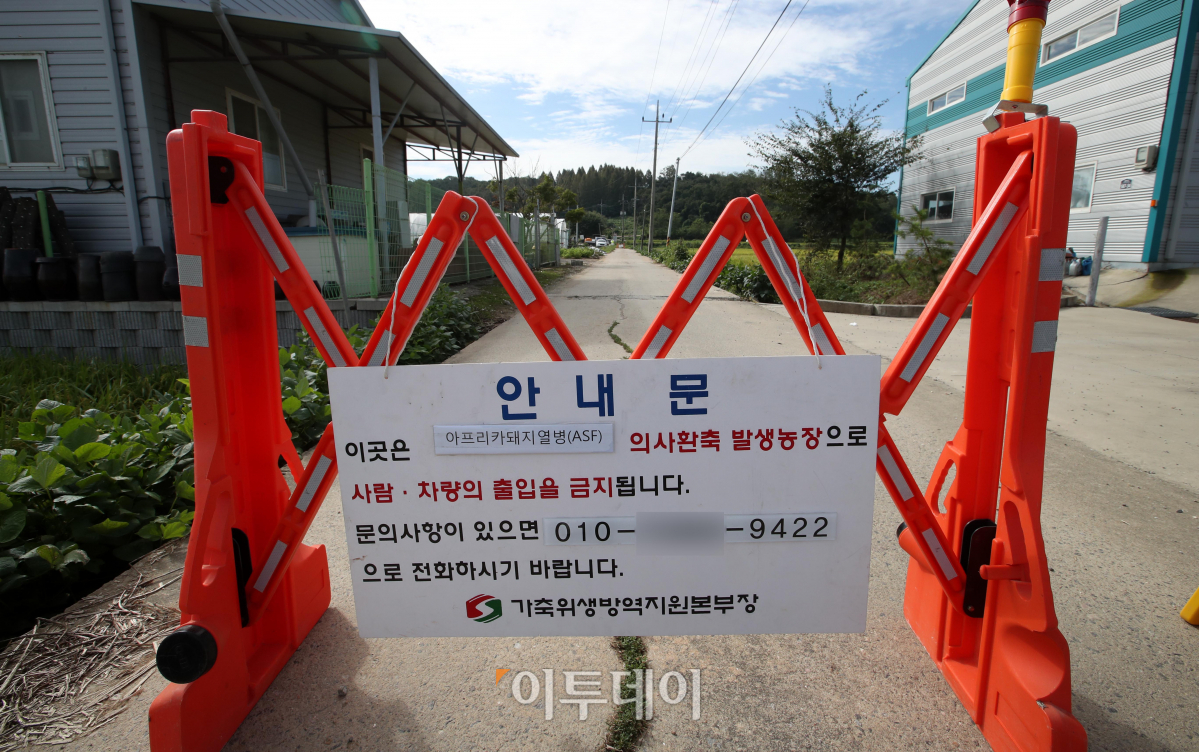 17일 돼지 전염병인 아프리카돼지열병(ASF)이 발생한 경기도 파주시의 한 양돈농장 입구에서 출입이 통제된 채 소독 작업 및 역학조사 등이 이뤄지고 있다. ‘돼지 흑사병’으로 불리기도 하는 ASF는 바이러스성 제1종 가축전염병으로 치사율이 100%에 달하는 등 치명적이나 아직 예방백신이 개발되지 않았다. 사람에게는 전염되지는 않는다.