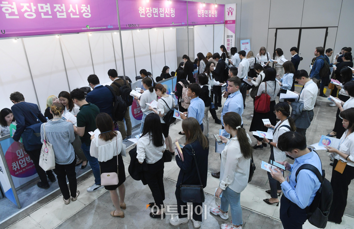 18일 서울 강남구 영동대로 코엑스에서 열린 ‘2019 외국인 취업박람회’에서 구직자들이 현장면접 신청을 위해 줄지어 기다리고 있다. 서울시와 서울산업진흥원(SBA)이 주최한 이번 취업박람회엔 OCI, 구찌코리아 등 다양한 업종의 국내기업 70여개사가 참여해 외국인 구직자들과 현장면접을 진행했다.