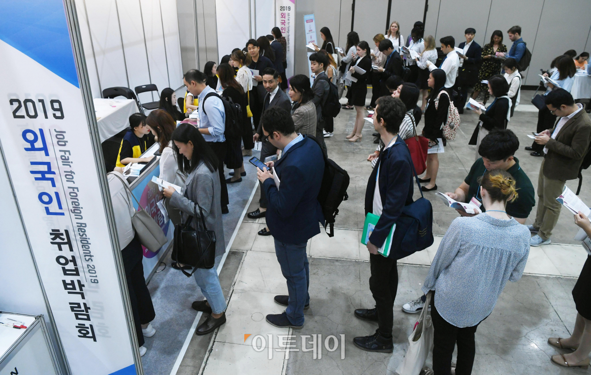 18일 서울 강남구 영동대로 코엑스에서 열린 ‘2019 외국인 취업박람회’에서 구직자들이 현장면접 신청을 위해 줄지어 기다리고 있다. 서울시와 서울산업진흥원(SBA)이 주최한 이번 취업박람회엔 OCI, 구찌코리아 등 다양한 업종의 국내기업 70여개사가 참여해 외국인 구직자들과 현장면접을 진행했다.