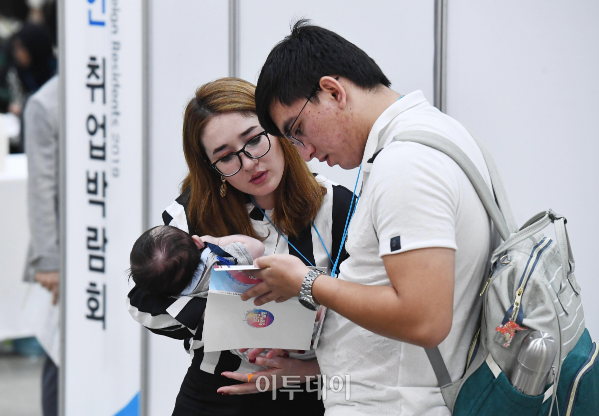 18일 서울 강남구 영동대로 코엑스에서 열린 ‘2019 외국인 취업박람회’에서 한 외국인 구직자 부부가 안내 책자를 살펴보고 있다. 서울시와 서울산업진흥원(SBA)이 주최한 이번 취업박람회엔 OCI, 구찌코리아 등 다양한 업종의 국내기업 70여개사가 참여해 외국인 구직자들과 현장면접을 진행했다.