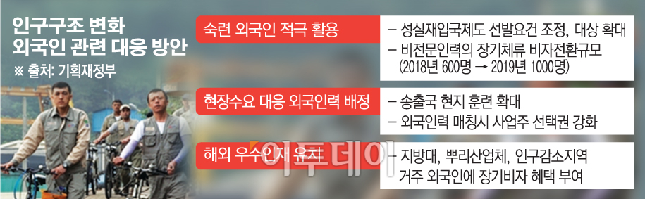이와 함께 생산연령인구(15~64세) 감소에 따른 기업들의 인력난을 해소하기 위해 고용허가제 활용을 확대하고, 중장기적으론 ‘한국형 이민관리체계’를 구축한다. 외국인 취업자의 성실재입국제에 대한 재입국 제한기간(3개월)을 단축하고, 근무요건을 동일 사업장에서 동일 업종·직종으로 확대한다. 비전문인력(E-9)의 장기체류(E-7) 비자 전환규모도 늘린다.