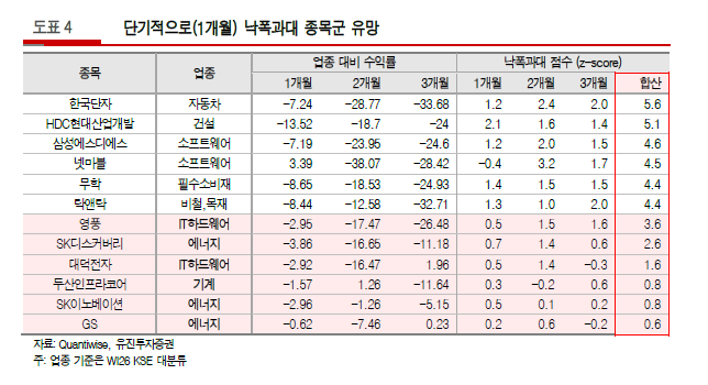 2001년 1월 미국 기준금리 인하 이후, 1달 간 낙폭과대 종목군의 코스피 200 대비 수익률은 상위 5% 수준으로 매우 우수했다. 현재 미국 기준금리 관련한 코스피 200 지수 흐름이 2001년 1월 당시와 비슷하고, 미국 기준금리 인하 효과로 단기적으로 투자심리가 개선될 것이라는 점을 감안할 때 업종 내에서 낙폭이 과대했던 종목이 단기적으로 수혜를 볼 것이라는 전망이다. 김 연구원은 관심종목으로 한국단자, 현대산업개발, 삼성SDS 등을 제시했다.