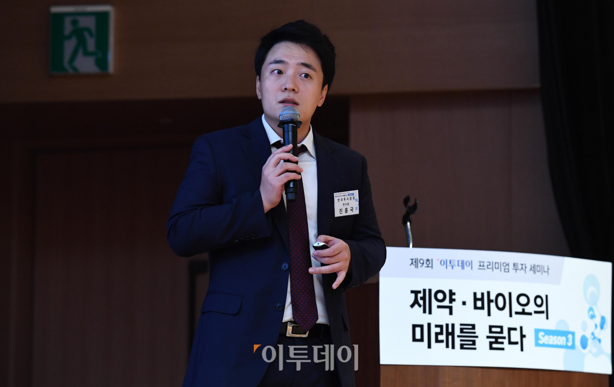 진홍국 한국투자증권 제약·바이오 연구원이 19일 서울 여의도 한국교직원공제회관에서 열린 제9회 프리미엄 투자 세미나 ‘제약·바이오의 미래를 묻다 시즌 3’에서 ‘앞으로는 바뀌게 될 바이오 투자 관행’을 주제로 강연하고 있다. 이투데이미디어가 주최한 이날 행사에선 리서치센터 제약·바이오 담당 연구원들이 직접 코오롱티슈진, 에이치엘비, 신라젠 등 주요 제약 바이오 기업에 대한 평가 진단과 함께 제약·바이오 업종 대표 종목 전망 및 유망 종목 발굴 등을 주제로 강연했다.