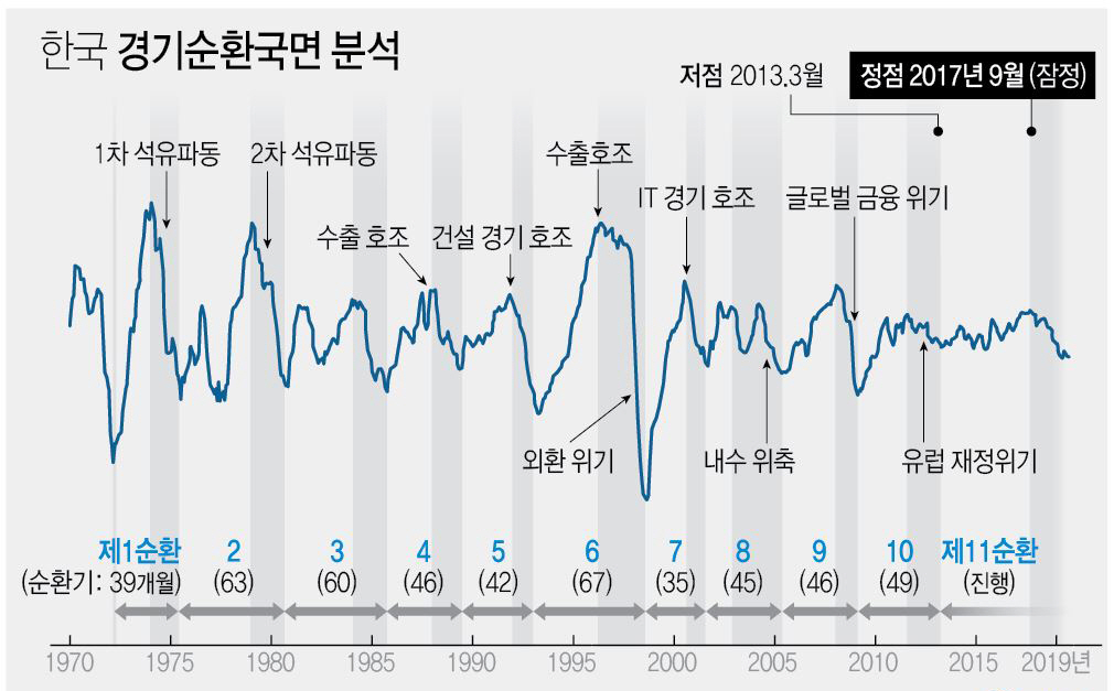 이는 수출 의존도가 높은 경제구조에 기인한다. 국가의 종합적인 가격수준인 국내총생산(GDP) 디플레이터는 2분기 내수 부문이 1.7% 상승했지만, 수출 부문이 2.0% 하락하면서 ‘마이너스(-0.7%)’로 전환됐다. 세계 경제성장률 둔화가 글로벌 교역규모 축소로, 다시 한국의 수출 감소로 이어지면서 물가에까지 영향을 미치는 것이다. 통계청은 경기 기준순환일(정점)을 설정하면서 “2017년 9월 이후 조정국면을 맞이한 가운데 2018년 들어 세계 경제성장률 둔화 및 미·중 무역분쟁 심화 등 대외환경이 악화하면서 국내 경기가 위축된 것으로 판단된다”고 밝혔다.