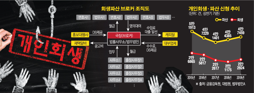 브로커 조직 운영의 한 축에는 인터넷 홍보업계도 있다. 회생업계의 성패는 회생·파산을 원하는 채무자들의 데이터베이스(DB)를 얼마나 많이 확보하느냐에 달려있기 때문이다. 브로커는 이 DB를 확보하는 데 수천만 원의 돈을 아끼지 않는다. 대규모, 조직적으로 회생·파산만 전담하는 만큼 ‘규모의 경제’를 활용하는 것이다. 회생뿐만 아니라 다양한 업무를 다루는 일반 법률사무소, 법무법인들은 이 DB 확보 경쟁에 끼어들 생각조차 하기 어렵다. 한 법무법인 소속 변호사는 “작년부터 회생·파산 쪽을 다루려고 공부도 하고 광고도 했다”면서도 “최근 광고 단가가 오르면서 수지가 맞지 않게 됐다. 사실상 손을 뗀 상태”라고 토로했다.