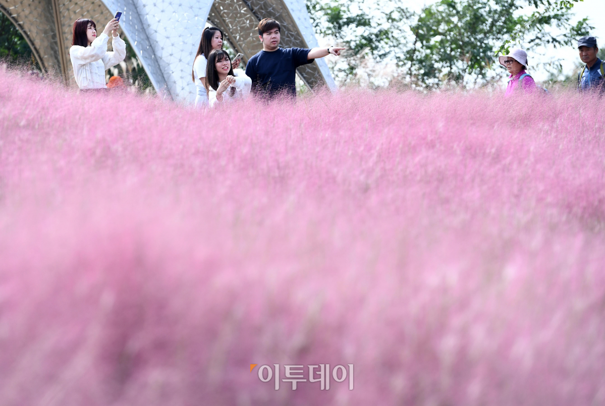 전국이 완연한 초가을 날씨를 보인 25일 서울 마포구 하늘공원을 찾은 시민들이 핑크뮬리 군락에서 사진 촬영을 하며 계절의 정취를 만끽하고 있다.