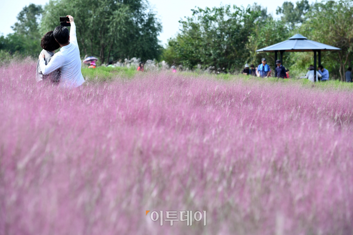 전국이 완연한 초가을 날씨를 보인 25일 서울 마포구 하늘공원을 찾은 시민들이 핑크뮬리 군락에서 사진 촬영을 하며 계절의 정취를 만끽하고 있다.