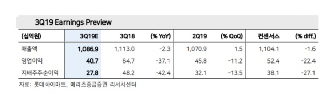 양지혜 메리츠종금즈원 연구원은 “롯데하이마트의 3분기 매출액은 전년 동기 대비 2.3% 감소한 1조900억 원, 영업이익은 37.1% 급감한 407억 원을 기록할 것”이라며 “이는 시장 예상치를 하회하는 수준”이라고 밝혔다.