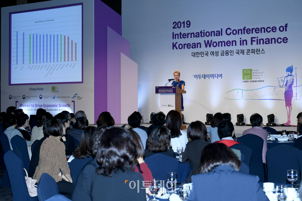 2019 대한민국 여성 금융인 국제 콘퍼런스가 27일 서울 중구 소공동 롯데호텔에서 열렸다. 이투데이 미디어와 여성금융인네트워크가 공동 개최한 이번 행사는 '여성이 경제를 살린다'를 주제로 '보다 나은 균형 잡힌 지속 가능한 사회를 위하여'라는 슬로건을 통해 여성의 경제활동 참여활성화 방안을 모색한다. 헤드위지 누엔스(Hedwige Nuyens) 세계은행연합회 사무국장이 '다양성과 포용성의 성과'를 주제로 특별 강연을 하고 있다.