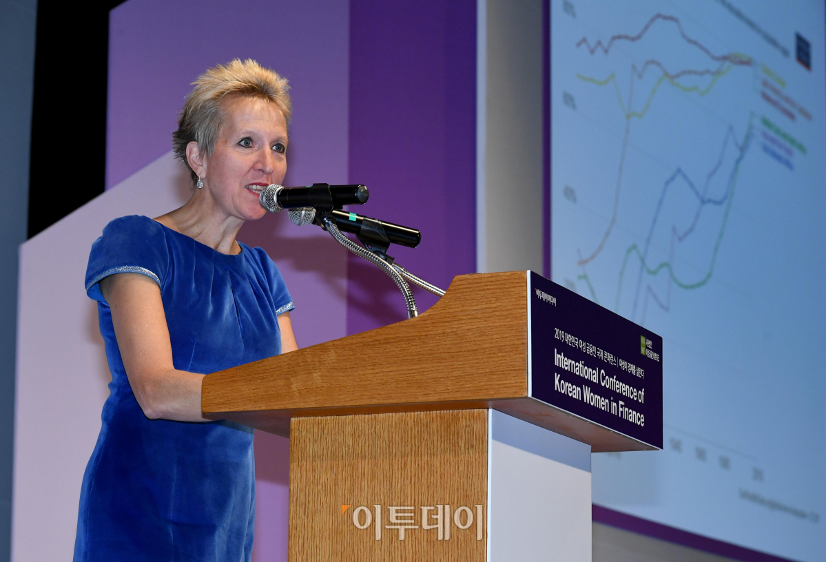 2019 대한민국 여성 금융인 국제 콘퍼런스가 27일 서울 중구 소공동 롯데호텔에서 열렸다. 이투데이 미디어와 여성금융인네트워크가 공동 개최한 이번 행사는 '여성이 경제를 살린다'를 주제로 '보다 나은 균형 잡힌 지속 가능한 사회를 위하여'라는 슬로건을 통해 여성의 경제활동 참여활성화 방안을 모색한다. 헤드위지 누엔스(Hedwige Nuyens) 세계은행연합회 사무국장이 '다양성과 포용성의 성과'를 주제로 특별 강연을 하고 있다.
