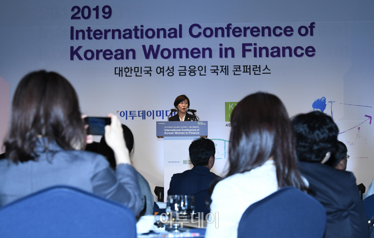 2019 대한민국 여성 금융인 국제 콘퍼런스가 27일 서울 중구 소공동 롯데호텔에서 열렸다. 이투데이 미디어와 여성금융인네트워크가 공동 개최한 이번 행사는 '여성이 경제를 살린다'를 주제로 '보다 나은 균형 잡힌 지속 가능한 사회를 위하여'라는 슬로건을 통해 여성의 경제활동 참여활성화 방안을 모색한다. 김희경 여성가족부 차관이 기조연설을 하고 있다.