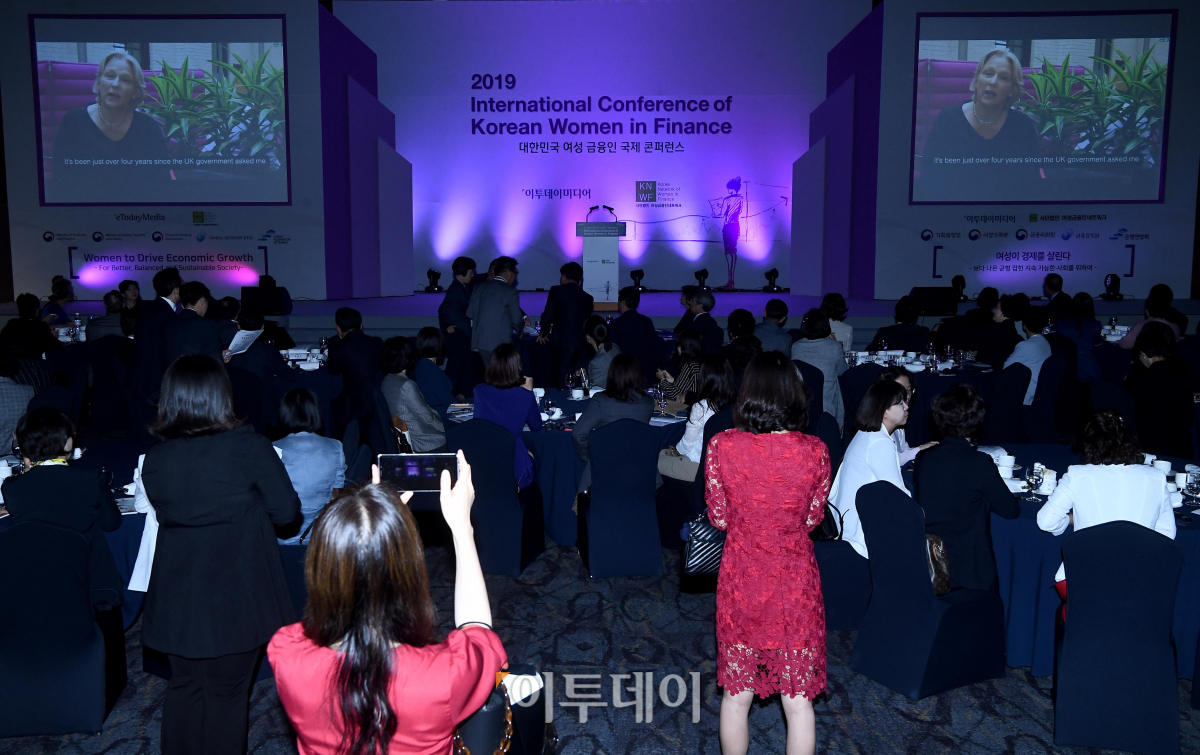 2019 대한민국 여성 금융인 국제 콘퍼런스가 27일 서울 중구 소공동 롯데호텔에서 열렸다. 이투데이 미디어와 여성금융인네트워크가 공동 개최한 이번 행사는 '여성이 경제를 살린다'를 주제로 '보다 나은 균형 잡힌 지속 가능한 사회를 위하여'라는 슬로건을 통해 여성의 경제활동 참여활성화 방안을 모색한다. 참석자들이 제인 앤 가디아(Jayne-Anne Gadhia) 버진 머니 CEO의 축전영상을 보고 있다.