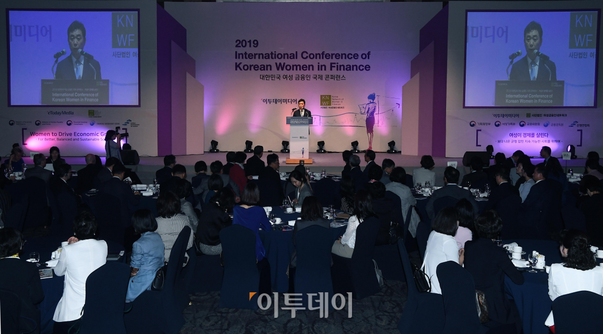 2019 대한민국 여성 금융인 국제 콘퍼런스가 27일 서울 중구 소공동 롯데호텔에서 열렸다. 이투데이 미디어와 여성금융인네트워크가 공동 개최한 이번 행사는 '여성이 경제를 살린다'를 주제로 '보다 나은 균형 잡힌 지속 가능한 사회를 위하여'라는 슬로건을 통해 여성의 경제활동 참여활성화 방안을 모색한다. 김상철 이투데이미디어 대표이사가 개회사를 하고 있다.