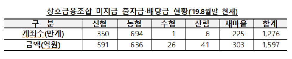 금감원 관계자는 “상호금융조합에서 출자금ㆍ배당금을 찾아가지 않은 탈퇴조합원(계좌수 기준 1276만 명)이 보유한 미지급 출자금ㆍ배당금의 환급이 원활히 이뤄질 것으로 기대한다”고 말했다.