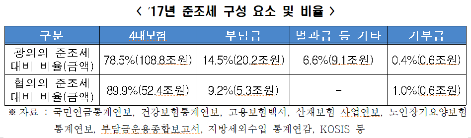 2016년 대비 2017년 광의의 준조세 증가분을 분석한 결과, 건강보험이 2조8000억 원, 국민연금이 2조4000억 원 등 4대 보험 보험료만 약 6조 원이 증가했다.