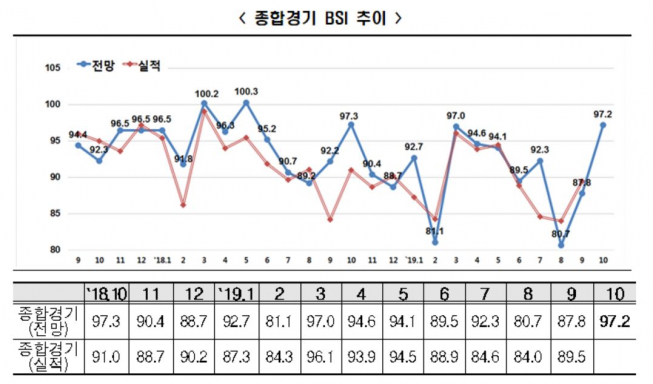 한국경제연구원이 30일 매출액 기준 600대 기업을 대상으로 기업경기실사지수(BSI)를 조사한 결과, 10월 전망치는 97.2을 기록하며 지난달 전망(87.8)에 비해 상승했지만 여전히 기준선인 100 이하에 머물렀다.
