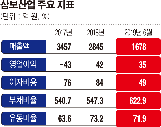 특히 부채총계 중 79%가 1년 내 갚아야 하는 유동부채라는 점이 재무안정성을 더욱 저해시키는 요인이다. 이 때문에 삼보산업을 감사한 외부감사인은 유동자산 대비 유동부채가 과도하다며 2017년에 이어 지난해에도 계속기업으로서의 존속능력에 유의적 의문을 제기할 만한 중요한 불확실성이 존재한다고 지적했다.