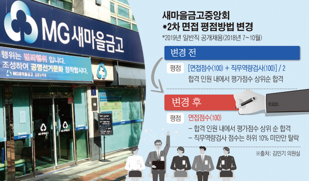 새마을금고중앙회가 지난해 진행한 공채에서 면접점수를 임의로 조정해 합격자가 뒤바뀐 사실이 행정안전부의 감사로 드러났다. 갑자기 면접 평가가 뒤바뀌면서 불합격에서 합격으로 분류된 12명 중 10명이 그해 최종 합격했고, 합격이었던 4명은 점수가 조정되면서 최종면접도 오르지 못하고 탈락했다.