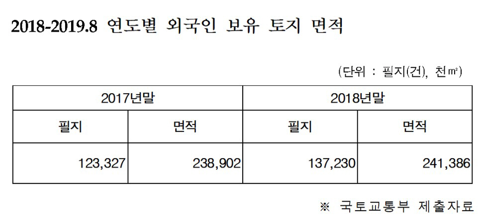 3일 이용호 의원(무소속, 남원·임실·순창)이 국토교통부에서 제출받은 자료에 따르면 지난해 말 외국인이 소유한 토지는 총 13만 7230개 필지, 면적은 241.386㎢에 달했다. 여의도 면적(2.9㎢)의 83배가 넘는 땅이 외국인 소유인 것이다. 전년(12만 3327개 필지, 면적 238.902㎢)보다 모두 증가한 규모다.