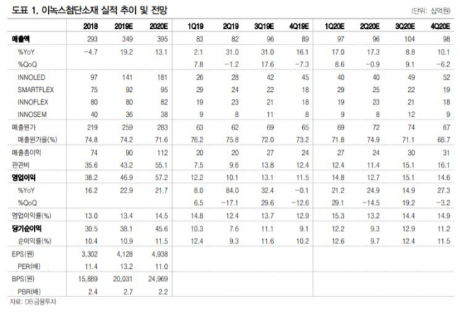 아울러 ”향후 LGD 광저우 라인의 캐파 증설과 함께 추가적인 라인 증설도 진행될 예정“이라며 ”2020년 OLED 소재의 매출 성장이 기대된다“고 덧붙였다.