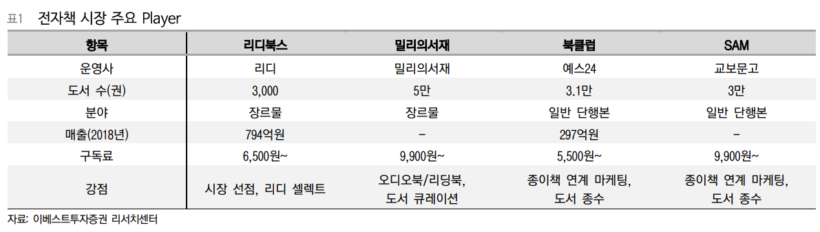 디지털 부문은 가장 큰 적자를 기록하고 있지만, 잠재력이 큰 사업부라고 분석했다. e북 시장은 구독 비즈니스로 진화하면서 매년 매출액이 증가하고 있다. ‘북클럽’ 서비스를 출시해 8만명의 구독 회원을 모집했다. 종이책ㆍ전자책 대여 연계 회원제, 가격 경쟁력, 광범위한 작가 네트워크를 바탕으로 시장 침투에 속도를 내고 있다.