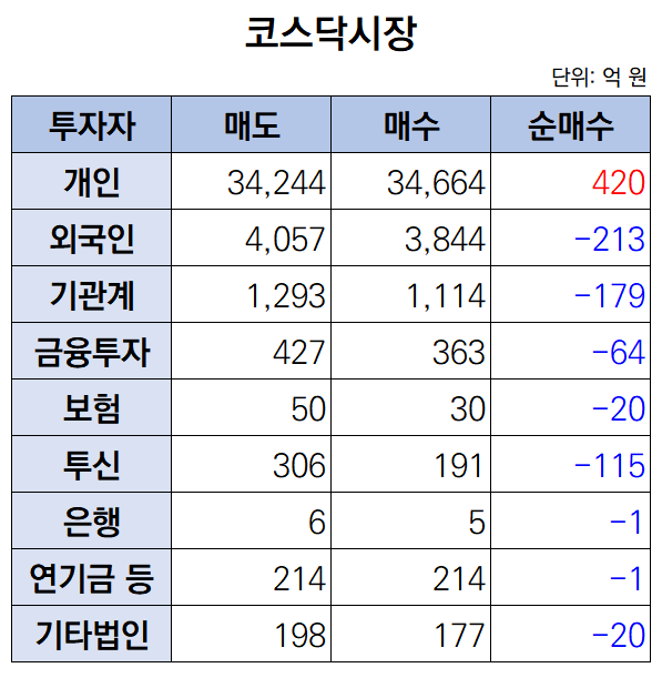 이날 외국인은 213억 원, 기관은 179억 원 어치를 순매도했다. 반면 개인은 420억 원 어치를 순매수한 것으로 집계됐다.