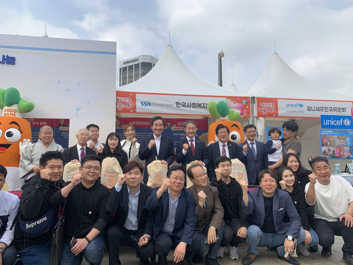 5일 본격적인 행사 시작에 앞서 이낙연 국무총리와 박능후 보건복지부 장관, 서상목 한국사회복지협의회 회장, 손봉호 나눔국민운동본부 대표, 윤세아 한국사회복지협의회 홍보대사 그리고 행사 참가자들이 기념 촬영을 하고 있다.