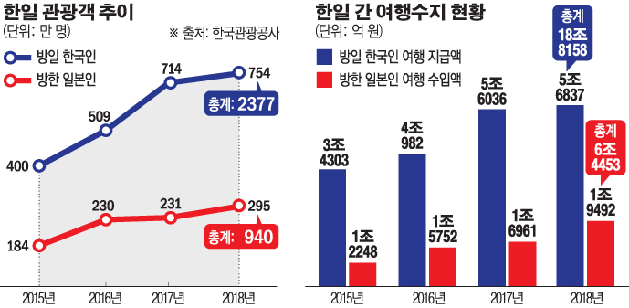 아울러 양국 교류 방문 인원은 꾸준히 증가하고 있지만, 일본에 가는 한국인의 증가세가 더 가팔랐다. 우리 국민의 일본 방문은 2015년 400만 2095명에서 2018년 753만 8952명으로 88.4%(353만 6857명) 증가했지만, 일본인의 한국 방문은 2015년 183만 7782명에서 2018년 294만 8527명으로 60.4%(111만 745명) 증가에 그쳤다.