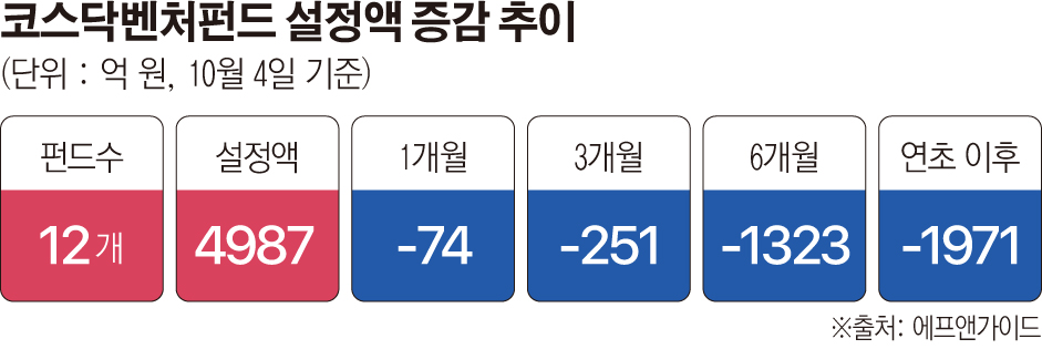 6일 금융정보업체 에프앤가이드에 따르면 국내 설정된 12개 공모형 코스닥벤처펀드의 설정액은 총 4987억 원으로 집계됐다. 최근 1개월 새 74억 원이 빠져나가면서 5000억 원대가 무너진 것이다.