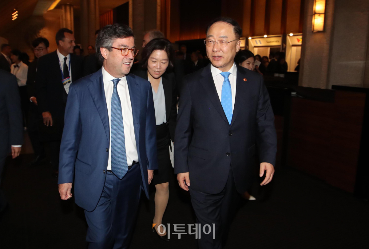 홍남기 경제부총리 겸 기획재정부 장관과 알베르토 모레노 미주개발은행(IDB) 총재가 7일 서울 중구 신라호텔에서 열린 ‘제5차 한-중남미 비즈니스 서밋’에 참석하고 있다.
