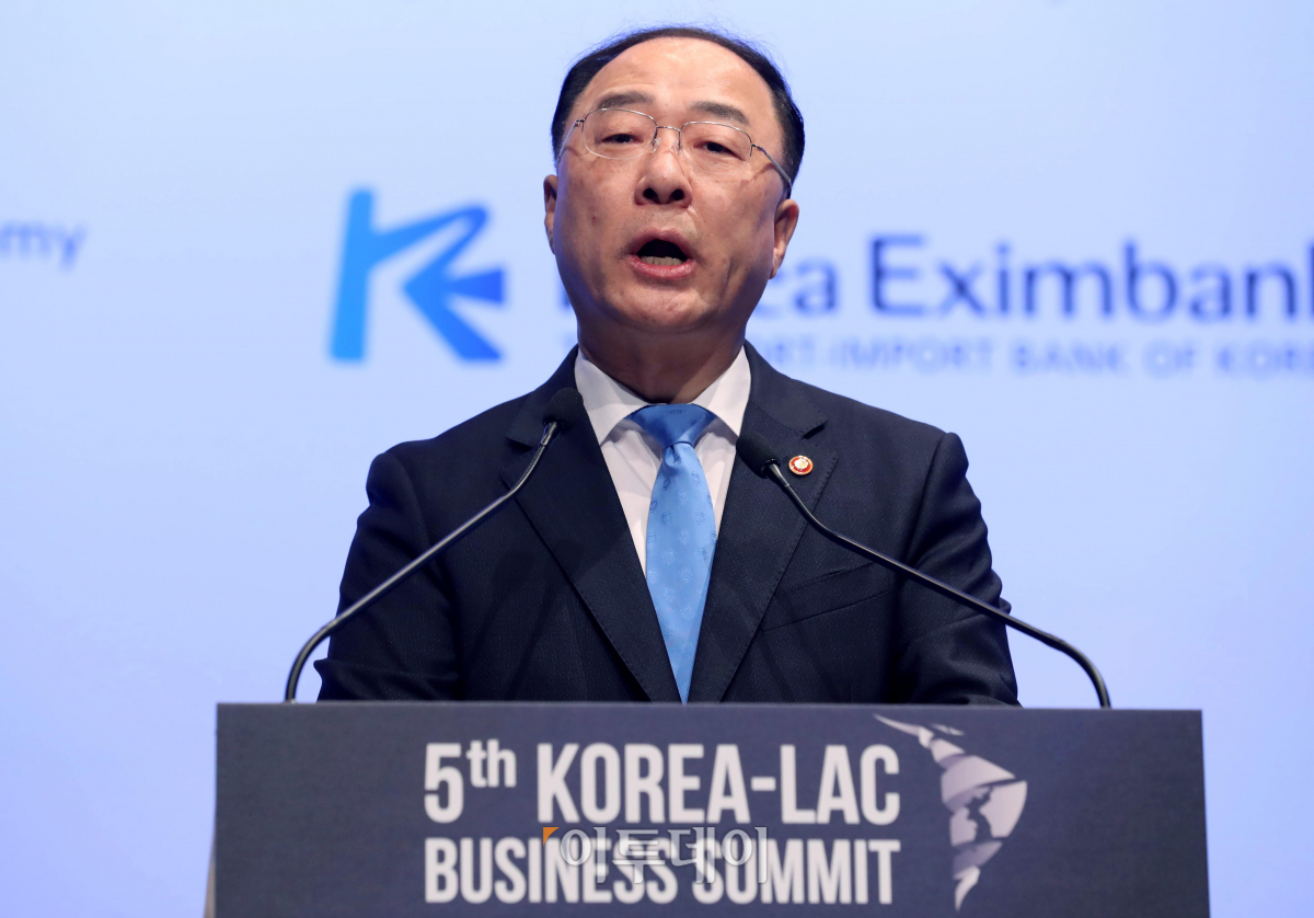 홍남기 경제부총리 겸 기획재정부 장관이 7일 서울 중구 신라호텔에서 열린 ‘제5차 한-중남미 비즈니스 서밋’에서 개회사를 하고 있다.