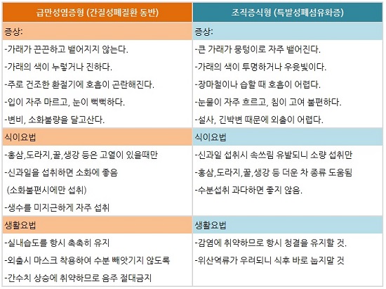 간질성폐질환 환자들은 염증이 원인이기 때문에 급만성 폐렴에 따라 병이 계단식으로 진행될 수 있어 염증을 주의해야 하며, 염증이기 때문에 치료예후는 긍정적일 수 있다는 것이 매우 놀랍다. 외출 시 찬공기, 오염공기, 건조한 공기, 병원균 등의 차단을 위해 마스크를 항시 착용하는 것이 중요하고, 실내 습도를 적절히 유지하여 호흡기가 과민해지지 않도록 주의한다.
