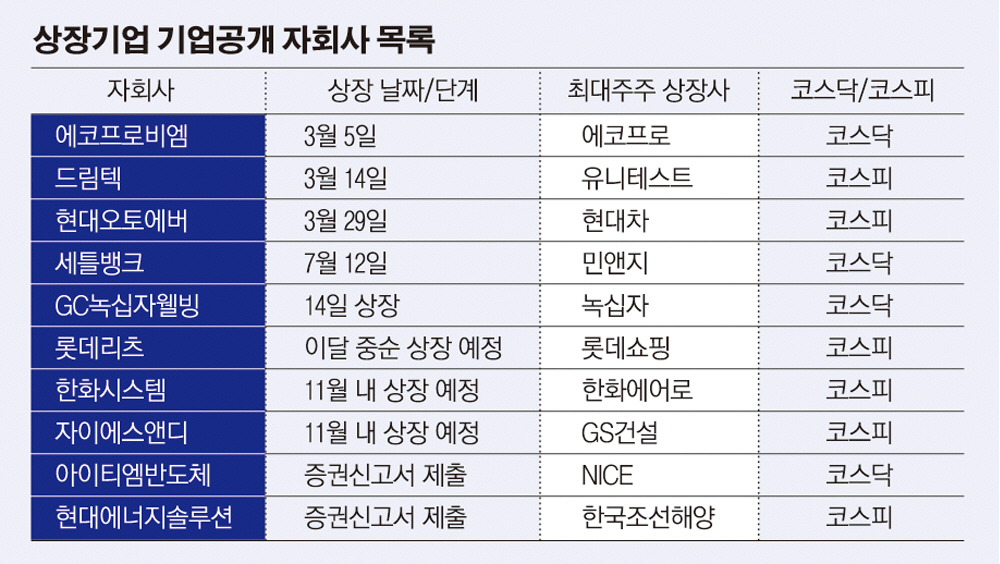 코스피 시장에서는 올해 상장한 2개 기업이 모두 상장사를 최대주주로 둔 회사다. 3월 코스피에 입성한 드림텍의 최대주주는 비메모리 반도체 유통업체 유니퀘스트다. 같은 달 상장한 현대오토에버는 현대차그룹의 정보기술 전문 서비스 자회사다. 현대차, 기아차 등이 주요 주주다. 코스닥에서는 에코프로비엠(에코프로), 세틀뱅크(민앤지) 등이 상장을 완료했다.