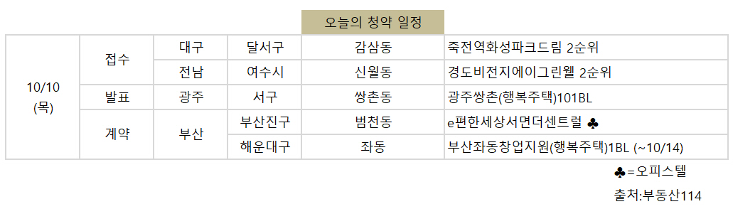 광주 서구 쌍촌동 광주쌍촌(행복주택) 101블록 단지가 당첨자를 발표하고, 부산의 부산진구 범천동 ‘e편한세상 서면 더센트럴’(오피스텔)과 해운대구 좌동 창업지원 행복주택 1블록이 계약을 진행한다.