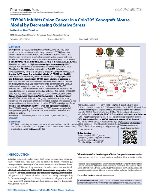 이대연 포레스트한방병원 병원장과 이인희 연구소장의 공동 연구 논문 ‘Herbal Medicine FDY003 Inhibits Colon Cancer in Colo205 Xenograft Mouse Model by Decreasing Oxidative Stress’가 SCI급 국제 학술지(pharmacognosy magazine) 9월호에 등재됐다.