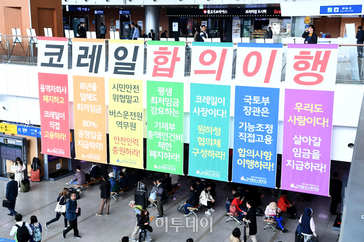 전국철도노동조합의 한시 파업을 하루 앞둔 10일 서울 용산구 서울역에 노조의 요구사항이 적힌 현수막이 걸려 있다. 노조는 11일 오전 9시부터 14일 오전 9시까지 사흘간 파업을 벌이며, 이 기간 KTX와 새마을호 등 여객열차와 화물열차가 20∼60%가량 감축 운행될 수밖에 없어 이용객 불편과 수출업계의 업무 차질이 우려되고 있다. 철도노조는 인건비 정상화와 4조 2교대 도입, KTX·SRT 올해 안 통합, 자회사 처우 개선 등을 요구하며 2016년에 이어 3년만에 파업을 결정했다.