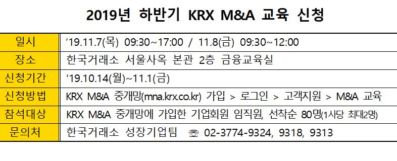11일 한국거래소에 따르면 지난 7일부터 양일간 서울사옥에서 M&A 매칭플랫폼인 ‘KRX M&A 중개망’ 가입 회원(상장사 등)을 대상으로 ‘2019년 하반기 KRX M&A 교육’을 시행했다.