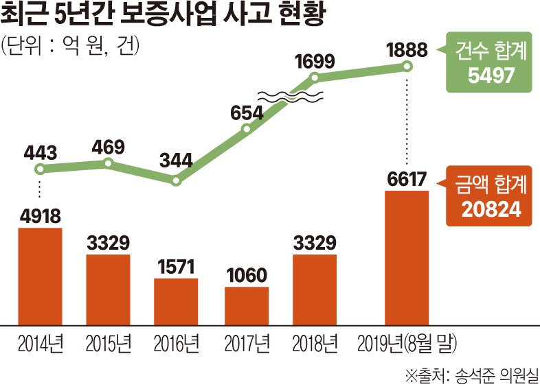 13일 국회 국토교통위원회 송석준 의원이 주택도시보증공사(HUG)에서 제출받은 보증사고 현황에 따르면 올해 8월 말 현재 보증사고 건수는 총 1888건, 보증사고 금액은 6617억 원에 달했다. 2014년 이후 발생한 보증 사고로는 건수와 금액 모두 최대 규모다.