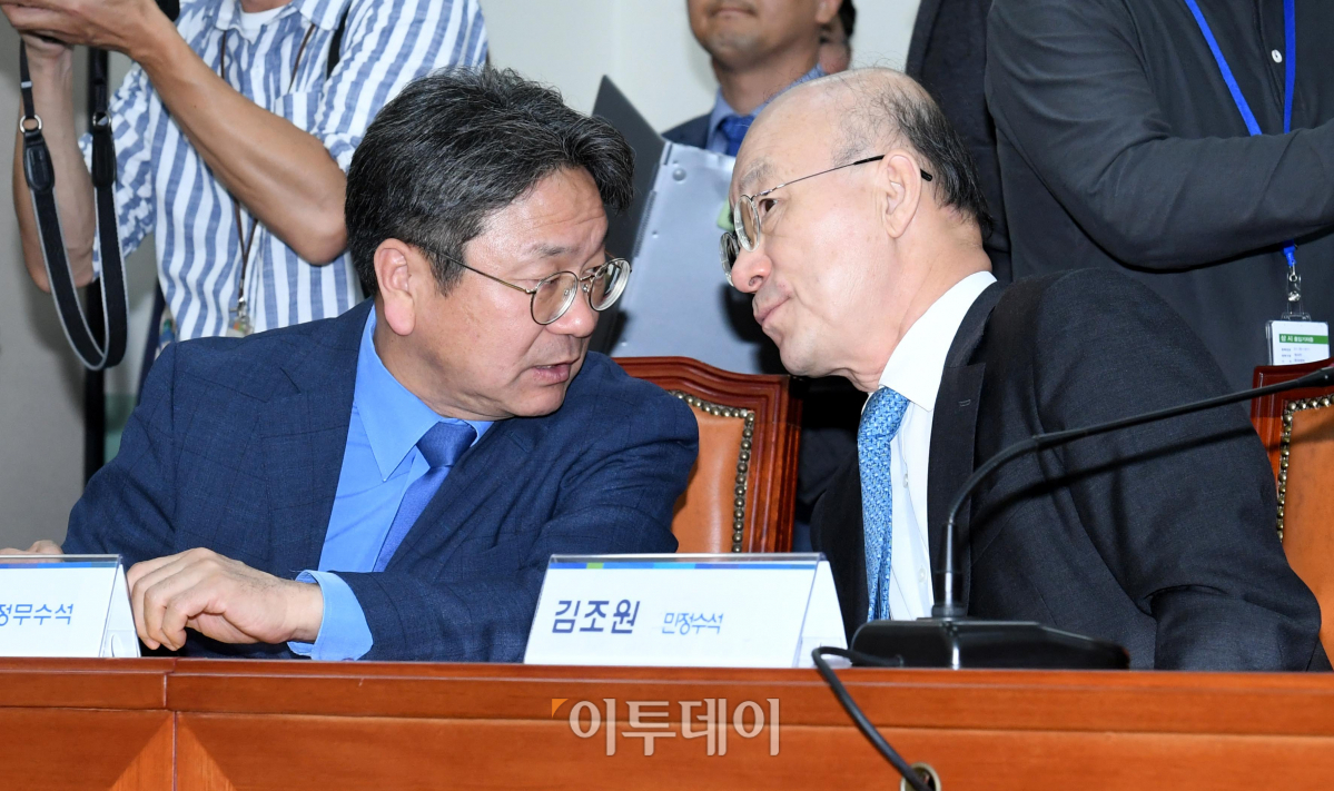 강기정(왼쪽) 청와대 정무수석과 김조원 민정수석이 13일 서울 여의도 국회에서 열린 검찰개혁 방안 논의를 위한 고위 당정청협의회에서 대화하고 있다.
