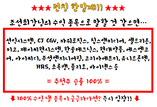 주식으로 매일 수익나는게 가능할까요? 조선최강님과 함께라면 가능합니다. 20년 경험 노하우를 살려 직접 연구 개발한 ‘수익비결’은 변동성 심한 지금 시장에서도 완벽하게 통하고 있습니다. 그 비결을 전수받고 싶으신 분, 수익과 실력을 동시에 잡고 싶으신 현명한 투자자는 지금 바로 조선최강님과 함께하세요.