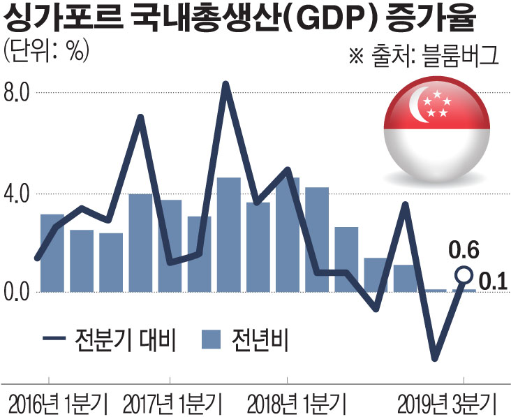 싱가포르의 올해 3분기 국내총생산(GDP)은 전분기 대비 0.6% 증가해 2분기의 마이너스에서 가까스로 플러스로 전환했다. 그러나 이는 블룸버그 집계 전문가 예상치인 1.2%를 크게 밑도는 것이다. GDP는 지난해 같은 기간과 비교해서는 0.1% 증가해 2분기와 같았다.