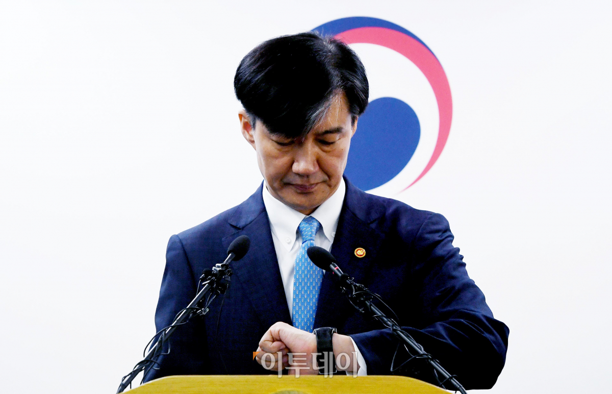 조국 법무부 장관이 14일 경기 과천시 정부과천청사에서 열린 검찰개혁방안 브리핑에서 시계를 보고 있다.