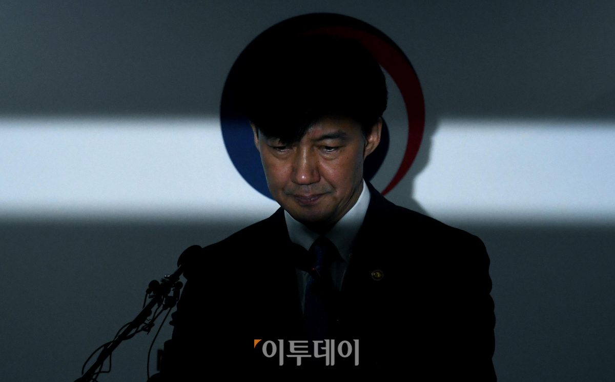 조국 법무부 장관이 14일 경기 과천시 정부과천청사에서 검찰개혁방안 브리핑을 갖던 중 잠시 생각에 잠겨 있다.