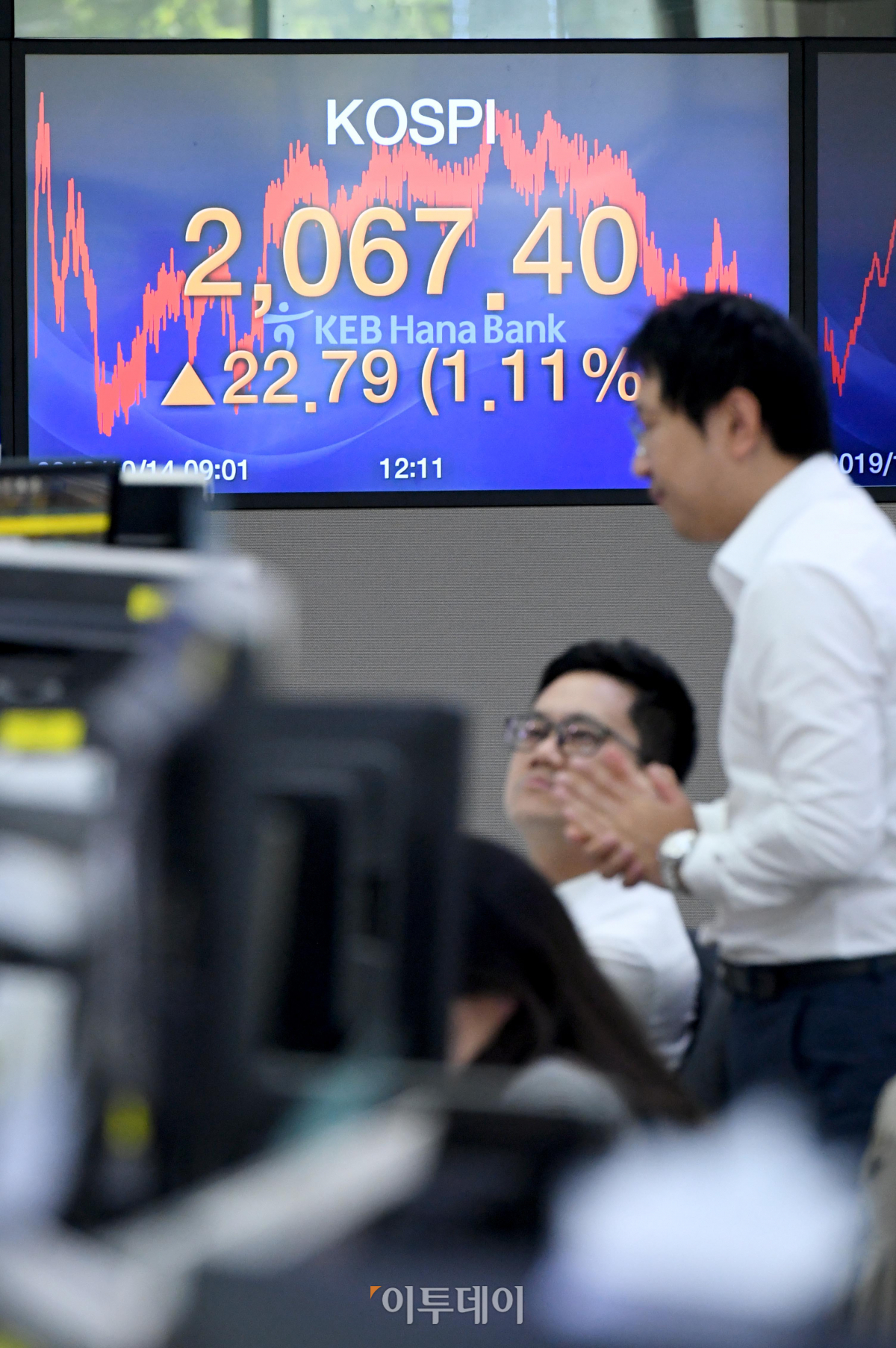 14일 서울 중구 KEB하나은행 딜링룸 전광판에 코스피가 전 거래일보다 22.79포인트(1.11%) 상승한 2067.40을 가리키고 있다.