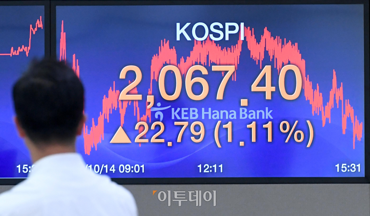 14일 서울 중구 KEB하나은행 딜링룸 전광판에 코스피가 전 거래일보다 22.79포인트(1.11%) 상승한 2067.40을 가리키고 있다.