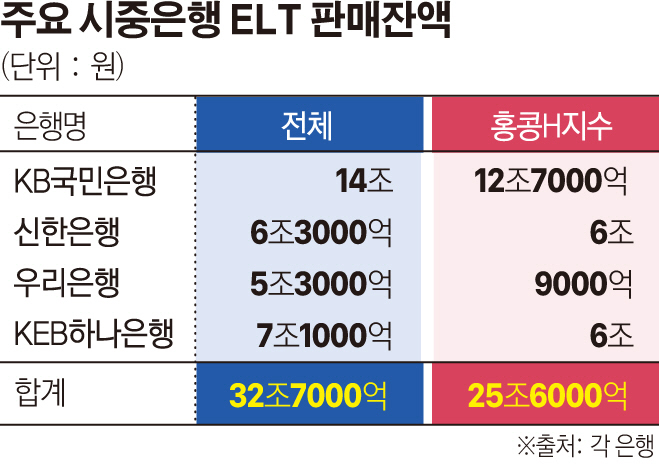 ELT는 주가연계증권(ELS)에 투자하는 특정금전신탁이다. 4개 시중은행의 판매 잔액은 9월 말 기준 32조7000억 원이다. 이 가운데 홍콩 H지수가 편입된 상품의 잔액은 25조6000억 원에 달한다.